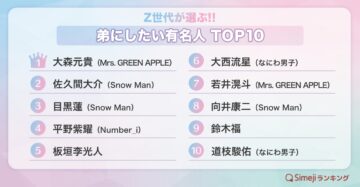 きせかえ顔文字キーボードアプリ「Simeji」が、「弟にしたい有名人」ランキングの結果を紹介。Number_iの平野紫耀さん、Snow Manの目黒蓮さん、なにわ男子の大西流星さん、「Mrs. GREEN APPLE」の大森元貴さん…1位に選ばれたのは?