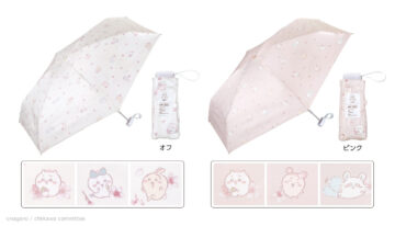 折りたたみ日傘「遮光ちいかわ お花見ミニ」は、ちいかわ、ハチワレ、うさぎ、モモンガ、古本屋がお団子や桜餅を食べながらお花見を楽しむ様子がデザイン。カラーはオフとピンクの2種類あります。