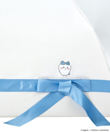 折りたたみ日傘「遮光ちいかわ ほめられリボンミニ」は、ちいかわとハチワレの友情を結ぶ様が描かれた「ほめられリボン」を題材にしてデザインされています。日傘本体には耳にリボンをつけたハチワレのイラスト、収納袋にはリボンを結ぶハチワレとリボンを大事にくくりつけた花瓶が描かれています。