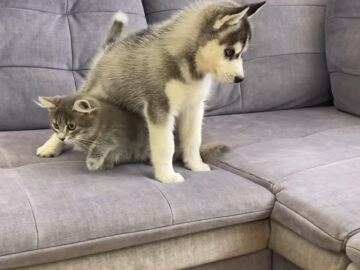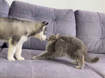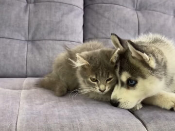 動画の冒頭から、ハスキーの子犬と子猫がお互いにニオイを嗅ぎながらソファの上で接近。しっぽを振って「新しい友達かな?」と観察するハスキーに対して、子猫は興味をひかれながらも少し及び腰です。