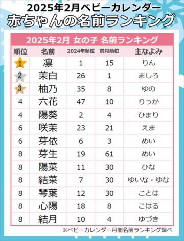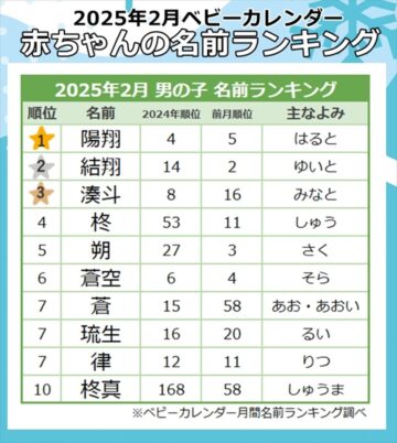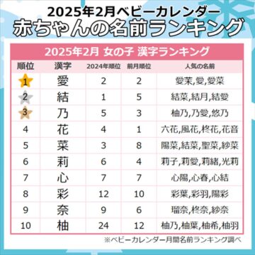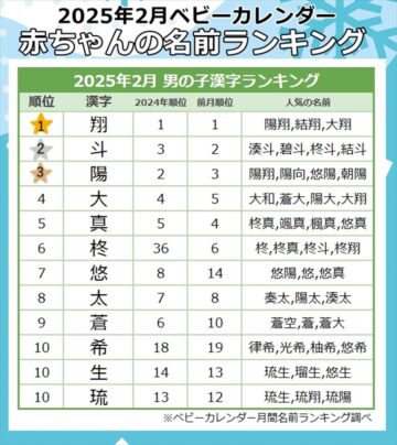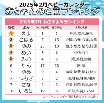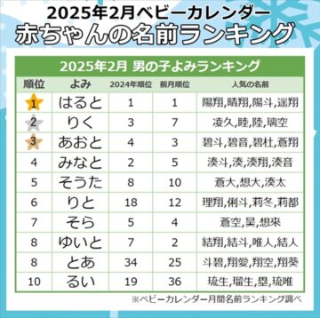 育児支援サイトを運営するベビーカレンダー(東京都渋谷区)が、2025年「2月生まれベビーの名付けトレンド」を発表しました。