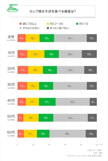 全回答者に「普段どのくらいの頻度で『カップ焼きそば』を食べているか」と聞くと、最も多かったのが、月に1日未満の「それより少ない」で41%でした。次いで「月に1日」と「月に2~3日」が同率で18%という結果になりました。また、「まったく食べない」と回答した人も13%いました。