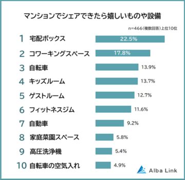 AlbaLinkが「マンションでシェアできたらうれしい設備」ランキングを公開しました。…1位は?