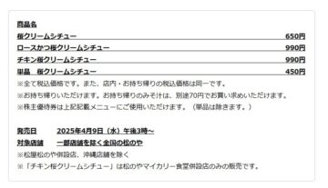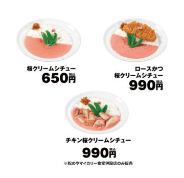 さらに、松のやの定番である、旨みが凝縮された熟成チルドポークをさっくりと揚げたロースかつを添えた「ロースかつ桜クリームシチュー」のほか、「チキン桜クリームシチュー」も新登場します。価格は両商品ともに990円です。