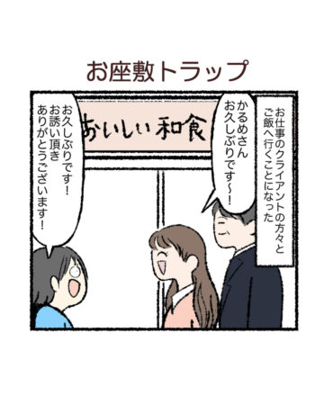 仕事のクライアントとの会食に出かけた作者。席が座敷だったため、靴を脱ぐことになったのですが、作者はある問題に気付いてしまい…。Instagramで公開された漫画が、「これは爆笑(笑)」「その後、バレませんでしたか?」と話題になった、作者の「かるめ」さんにお話を聞きました。