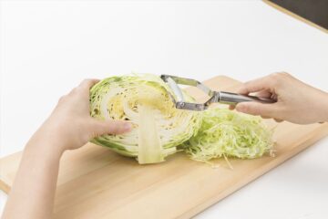 林さん「T型やI型の他に、 キャベツの千切りが簡単にできるワイドサイズのピーラーがあります。刃幅が長く大きな食材も楽にスライスすることができ、簡単にふわふわのキャベツの千切りをすることができます。キュウリのスライス、ゴボウのささがき、オニオンスライスなどもできます。