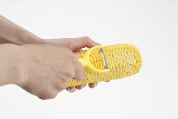 それと、トウモロコシの実を『ギザ刃』で一気に切り外すことができるピーラーもあります。生のトウモロコシ、ゆでたトウモロコシの両方に使用できます」