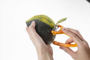 そのほかにも、カボチャの硬い皮もむけるピーラーもあります。食材を挟んで使用するものなのですが、すべり止めと刃で食材をしっかりおさえることができ、包丁や一般的なピーラーよりも安心感を持って手軽に作業できます。すべり止め側はカボチャの種取りとして使えます。カボチャ以外にも滑りやすく面倒な里芋、ジャガイモやリンゴなどの丸い食材にも使えます。