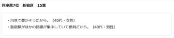 2位には「港区」(21票)がランクイン。都心へのアクセスのよさに加え、洗練された街並みや高級感あふれる暮らしが魅力なようで「高級感がある」(20代男性)、「おしゃれで街がきれい」(30代女性)、「交通の利便性が高いから」(40代女性)といった回答があったということです。