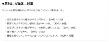 3位は「杉並区」(19票)でした。暮らしやすさと程よいゆとりを両立できる点が挙げられ、回答者からは「治安がよさそうで緑が多そう。文化的な感じもする」(30代女性)、「落ち着いているから」(60代女性)、「価格も高くなく、ターミナルへのアクセスもよい」(60代男性)といった声が寄せられたとのことです。