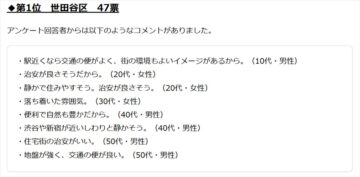 そして、1位は「世田谷区」(47票)でした。落ち着いた環境と自然の多さから、子育てしやすい街として人気が高く、幅広い世代から支持を集めたということです。回答では「駅近くなら交通の便がよく、街の環境もよいイメージがあるから」(10代男性)、「静かで住みやすそう。治安がよさそう」(20代女性)、「便利で自然も豊かだから」(40代男性)などのコメントが集まったとのことです。