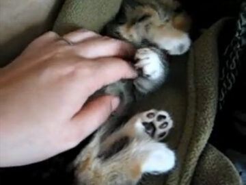 実はモクシーは、飼い主さんに保護された子猫。母猫やきょうだいとはぐれ、雨の中一人ぼっちでいたところを引き取られました。暖かい寝床で安心して眠る姿や、飼い主さんの手に擦り寄る様子から、新しい家族に早くも懐いている様子がうかがえます。