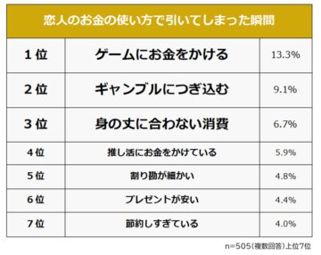 そして、1位は「ゲームにお金をかける」(13.3%)でした。「『生活に困っているから』と言われて貸したお金で、ゲームに課金していた」(20代女性)、「好きなスマホゲームに、一度に万を超える金額の課金を行っている姿を目撃したときに、少し引いてしまいました」(30代男性)などの回答が集まったとのことです。
