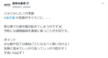 農水省は「ジメジメしたこの季節 #食中毒の危険がすぐそこに」とXに投稿し、「実は家でも食中毒が起きてしまうのです」「予防には調理器具を清潔に保つことが大切です」とコメント。
