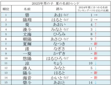 リクスタ(千葉県市川市)のアプリ・ウェブサイト「無料 赤ちゃん名づけ」が、「2025年男女別 夏にまつわる名前ランキングベスト15」を発表しました。ランキングは、2024年6月1日から2025年5月31日の期間、ウェブサイト、アプリのデータベースから、夏にまつわる名前で検索し、アクセス数の多い名前を抽出したということです。今回は「男の子」のランキングを紹介していきます。