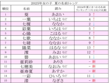 太陽や夏の日差しをイメージさせる「陽」という漢字が、最も多く使用されていて、2位「陽翔(はると)」くん、6位「朝陽(あさひ)」くん、10位「悠陽(はるひろ)」くん、13位「陽斗(はると)」くんといった、4つの名前が15位以内にランクインしました。