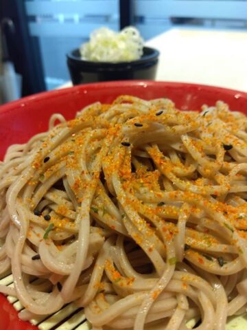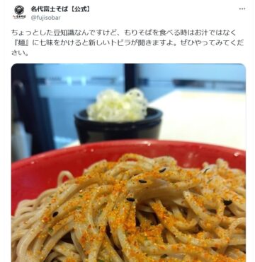 「名代富士そば」の公式Xアカウントは、「ちょっとした豆知識なんですけど、もりそばを食べる時はお汁ではなく『麺』に七味をかけると新しいトビラが開きますよ。ぜひやってみてください」と投稿。