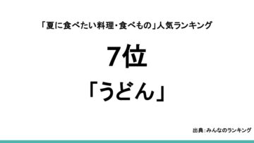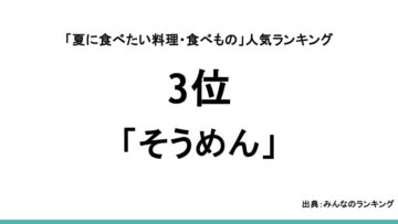 3位は「そうめん」でした。回答者からは「夏はさっぱりした物が食べやすい季節なので、するすると食べられるそうめんが食べたくなります」「そうめんは、早くゆで上がるし、アレンジがたくさんあって最高」「『冷たくて細くてつるつるの麺で喉越しがいい』って最高じゃないですか」といった声が寄せられていました。