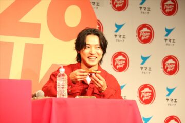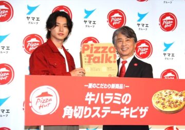 同日、東京都内で「青森県産にんにく香る 牛ハラミの角切りステーキピザ」と「炭火香ばしい 鹿児島県産黒豚ピザ」の発表会が実施。同社の代表取締役社長・篠崎幸男さんと、同商品の新テレビCMに出演する俳優の山崎賢人(崎は正しくはたつざき)さんが登壇しました。