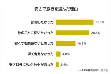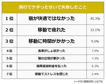 そして、1位は「宿が快適ではなかった」(45.3%)でした。「少しでも節約をしたいと思って、安いプランの旅館を選びました。部屋はあまりきれいではなく薄汚れていて、少しお金出してもうワンランク上げればよかったと思いました」(30代女性)、「宿泊ホテルを予約する際、普段の価格よりかなり安く出ていたので予約したが、安い理由は修繕期間だったからでした。早朝から夜まで音がうるさく、滞在時にストレスを感じることになってしまった」(50代以上男性)などの回答が集まったとのことです。