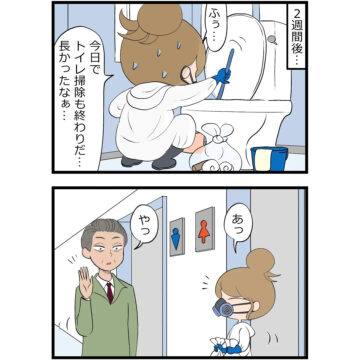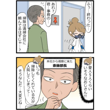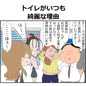 会社でトイレの清掃員のおばさんが2週間入院することになり、その間は自分たちで清掃することになった部署。「そんなに汚れないだろう」と思っていた主人公の女性でしたが、あっという間にひどい状況に。「掃除をしましょう」と部署の人たちに声を掛けたのですが…。読者からは、「部長さん、イケおじ!」「清掃の方々には改めて感謝ですね」「ラストのオチもすてき」などの声が上がっています。