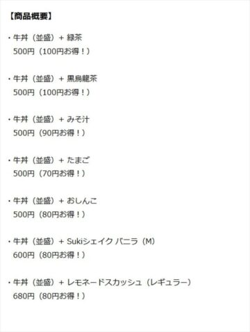 また、同日から「牛丼(並盛)」と「Sukiシェイク バニラ(M)」のランチコンボを600円、「レモネードスカッシュ(レギュラー)」とのランチコンボを680円で発売します。