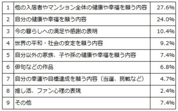 計337枚の短冊に書かれた内容を分類した結果、最も多かったのは、「他の入居者やマンション全体の健康や幸福を願う内容」(27.6%)で、「自分の健康や幸福を願う内容」(24%)を上回りました。具体的には「中楽坊の皆さまが、いつまでも幸せでありますように」「ここにいる皆が、健康で笑顔で過ごせますように」「皆さんが、いつまでも仲良く穏やかに暮らせますように」といった内容が目立ちます。またこれに、「世界の平和や社会の安定」「家族の健康や幸福」も加えると、他者の幸せを願う内容は全体の44%に上りました。