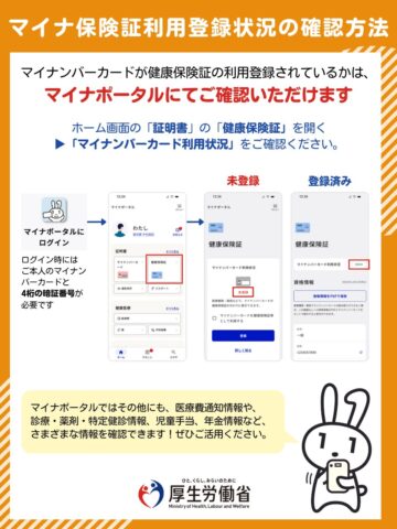 厚労省は「マイナ保険証の利用登録状況は、マイナポータルにログインすると簡単に確認できます」とXに投稿。その上で「登録状況が分からない場合でも、医療機関等にマイナンバーカードをお持ちいただければ、その場で登録状況の確認と利用登録ができるのでご安心ください」と説明しています。