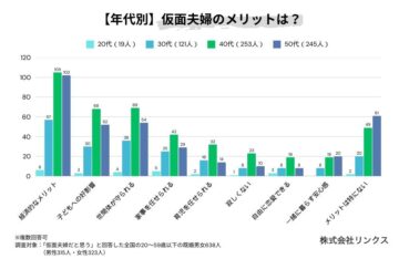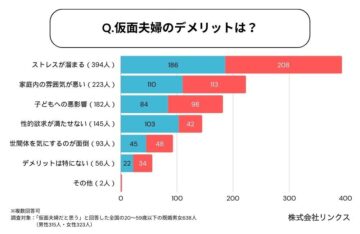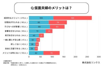 なお、同社によると、女性は「経済的なメリット」を理由に挙げた割合が男性より約18ポイント高く、男性は「家事・育児を任せられる」「一緒に暮らす安心感」「自由に恋愛できる」など、自身の生活維持を重視している傾向にあることが明らかに。仮面夫婦でいることのメリットに、男女差が浮き彫りとなりました。