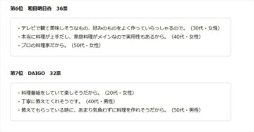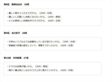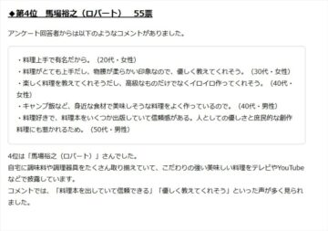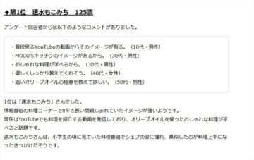 1位は俳優の速水もこみちさんで、125票でした。投票した人からは「普段見るYouTubeの動画からそのイメージがある」(10代・男性)、「MOCO’Sキッチンのイメージがあるから」(30代・男性)、「優しくしっかり教えてくれそう」(40代・女性)、「追いオリーブオイルの極意を教えてほしい」(50代・男性)などのコメントが集まったということです。