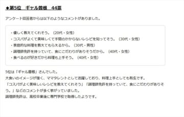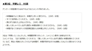 3位は料理愛好家でタレントの平野レミさんでした。95票を獲得。回答者からは「料理番組でよく見るので、料理がうまいと思うから」(20代・女性)、「すべてを許容してくれそう」(20代・女性)、「楽しくおしゃべりしながら面白い料理を教えてくれそうだから」(30代・女性)などの声が寄せられたということです。