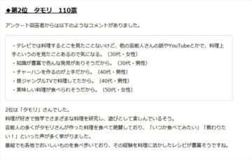 2位はタレントのタモリさんで、110票でした。バラエティー番組などで料理の腕前を披露していたこともあり、回答では、「テレビでは料理するとこを見たことないけど、他の芸能人さんの話やYouTubeとかで、料理上手というのを見たことあるので気になる」(30代・女性)、「昔『ジャングルTV ~タモリの法則~』(MBS・TBS系列)で料理してたから」(40代・男性)、「おいしい料理が食べられそうだから」(50代・女性)といった感想が見られたとのことです。