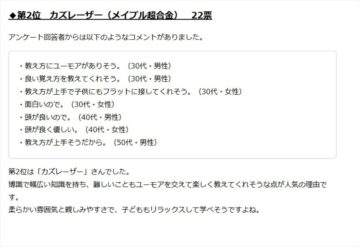 2位はお笑いコンビ「メイプル超合金」のカズレーザーさんで、22票でした。回答では「教え方にユーモアがありそう」(30代・男性)、「良い覚え方を教えてくれそう」(30代・男性)、「頭が良く優しい」(40代・女性)、「教え方が上手そうだから」(50代・男性)などの意見が見られたということです。