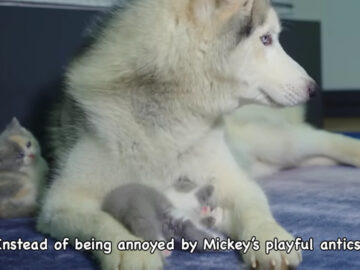 【画像5枚】「かっ…かわいすぎるっ……!!!」 これが、ハスキーの「ボビー」の前足の間で寝転がる子猫「ミッキー」の姿です!