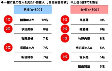 今田美桜、長澤まさみ、吉岡里帆 一緒に「夏の花火を見たい」芸能人ランキング…男性500人が選んだ1位は? 2025.08.08 著者 : オトナンサー編集部 キーワード : ランキング • ライフスタイル コメント (Twitter) Facebook B!Bookmark ホンダアクセスが「一緒に夏の花火を見たい芸能人」ランキングを紹介。1位に選ばれたのは? 今田美桜さん ホンダアクセス(埼玉県新座市)が、「家族での長距離ドライブに関する調査2025」を実施。その一環で調べた「一緒に夏の花火を見たい芸能人」の結果をランキング形式で紹介しています。 調査は6月27~30日にかけて、自家用車を運転する男性500人、女性500人の計1000人にインターネットで行われました。 男性500人のランキングの3位は俳優の新垣結衣さんと長澤まさみさん、吉岡里帆さんがランクイン。それぞれ7票ずつ獲得しました。2位は俳優の今田美桜さんで8票。 1位は綾瀬はるかさんで、12票という結果でした。 (オトナンサー編集部) 【えー!】女性500人は誰を1位に選んだ? 「一緒に夏の花火を見たい芸能人」ランキング女性編も見る! 画像ギャラリー