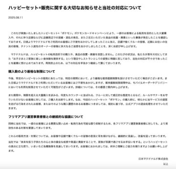 マクドナルドが、ハッピーセット「ポケモン」における「ポケモンカード」配布キャンペーンを巡る一連の問題について謝罪。今後の再発防止策を発表し、SNSでは期待の声のほか、厳しい声も多数上がっているようです。