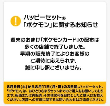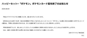 今回のハッピーセット「ポケモン」を巡っては、購入特典として8月9日〜11日の3日間限定で配布予定とされていた「ポケモンカード」が、配布初日に「早期終了」がアナウンスされる事態に。配布初日にはSNSで、各店舗に購入希望者が殺到している様子や、「買えなかった」という多数の報告が上がりました。
