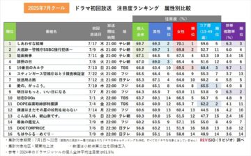 テレビの視聴データを計測するREVISIO(東京都千代田区)が、7月にスタートした2025年夏ドラマについて、初回放送の注目度ランキングを発表しました。
