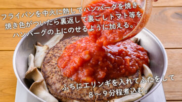 (3)フライパンを中火に熱してハンバーグを焼き、焼き色がついたら裏返して(B)をハンバーグの上にのせるように加えて、ふちにエリンギを入れてふたをして8~9分程煮込む。