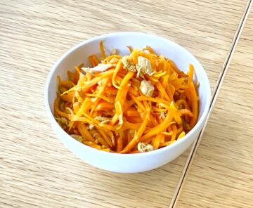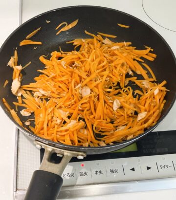 作り方について、「ニンジンは千切りにし、ごま油を引いたフライパンで炒め、油を切ったツナと調味料(みりん小さじ2、しょうゆ小さじ2分の1、顆粒だし小さじ2分の1)を加え、汁気がなくなるまで煮絡め完成。ニンジンの甘さとツナのうまみがマッチしておいしいです」と紹介しています。
