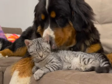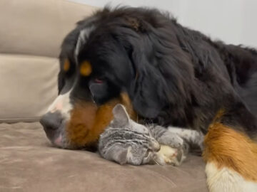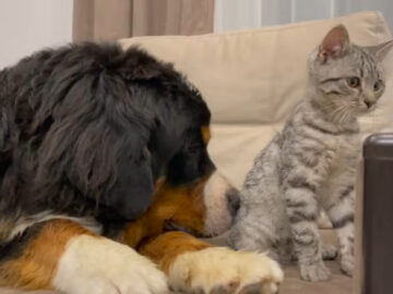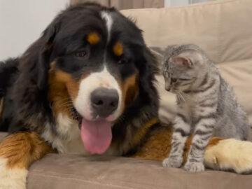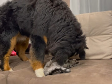 「いい加減起きてニャー!!」爆睡中の大型犬に全力アタックする子猫→大型犬の“反応”に視聴者「スゴイ包容力」