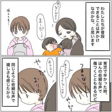 ポメさん「例えば、『スーパーの帰り道で、抱っこ紐には赤ちゃん、右手には2歳児くらいの子、左手には荷物がたくさん』。そんな『あの日の私』と同じようなママさんを見ると、思い出します」