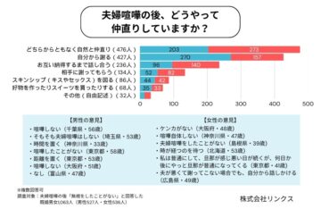 「無視をしたことがない」と回答した人(男女計1063人)に、「夫婦げんかの後、どうやって仲直りしているか」を聞いた結果(複数回答)、最多となったのは「どちらからともなく自然と仲直り」(476人)でした。次いで「自分から謝る」(427人)、「お互い納得するまで話し合う」(236人)と続いています。