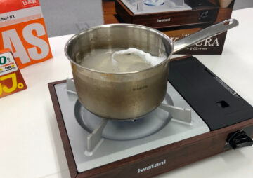 (3)耐熱皿を敷いた鍋でお湯を沸かし、そこにアイラップ入りの米を入れる。袋が鍋底や鍋肌に付かないように注意。