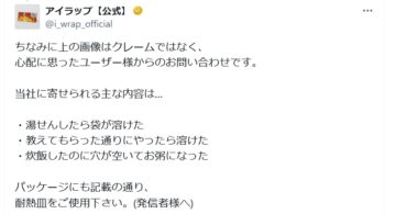 これまでにユーザーからは「湯せんしたら袋が溶けた」「教えてもらった通りにやったら溶けた」「炊飯したのに穴が空いておかゆになった」という情報が寄せられているということです。