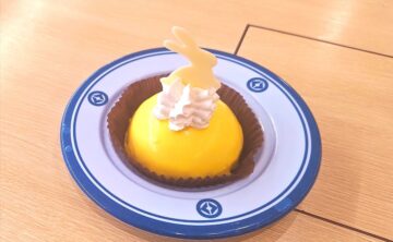 「月見ケーキ」は、ミルクムースの表面に黄色いグラサージュ(艶やかに仕上げるコーティング)を施して、月のような輝きを表現したスイーツ。ムースの軽やかさと、底面にあるザクザク食感のクランブルがアクセントになっています。お月見らしくウサギチョコを添えて、見た目もかわいらしいデザインになっています。430円。