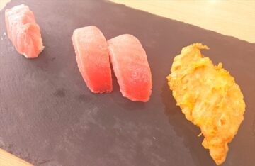 「月見ハンバーグ」は国産の黒毛和牛を使用したハンバーグの上に、月に見立てた濃厚チーズソースをトッピングした寿司です。肉汁あふれるハンバーグと、和風てりやき味のソースのうまみ、濃厚チーズソースのコクが一度に味わえます。230円。