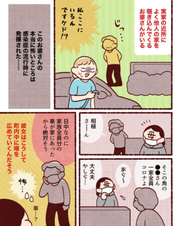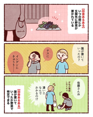 「いつの間にか玄関に野菜が置かれている」「他人の家をのぞきこんでくるおばさんがいる」など、作者の実家での「田舎あるあるエピソード」をまとめた内容で、読者からは「分かります!」「田舎はどこもこんな感じなんですね」などの声が上がっています。