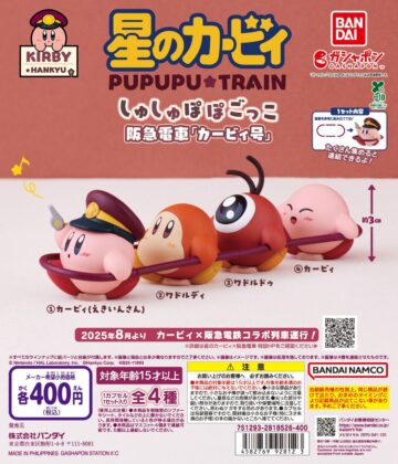 同カプセルトイは、人気ゲームシリーズ「星のカービィ」のキャラクターたちが電車ごっこをする「星のカービィ プププ☆トレイン」シリーズと、8月からラッピング列車「カービィ号」が運行開始するなどコラボレーション企画を展開中の「星のカービィ×阪急電車」のオリジナルデザインをモチーフとしたフィギュアです。