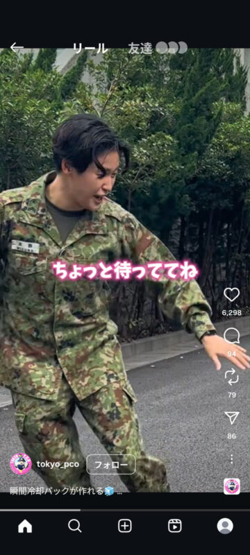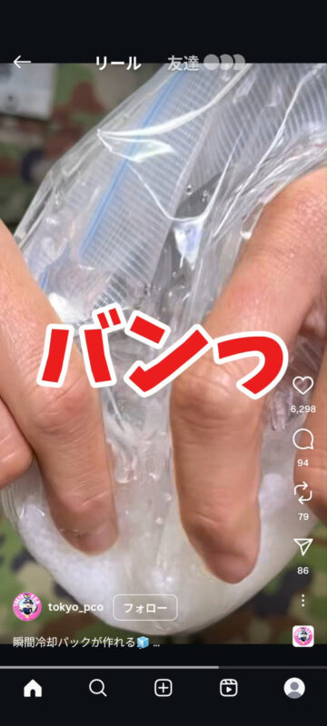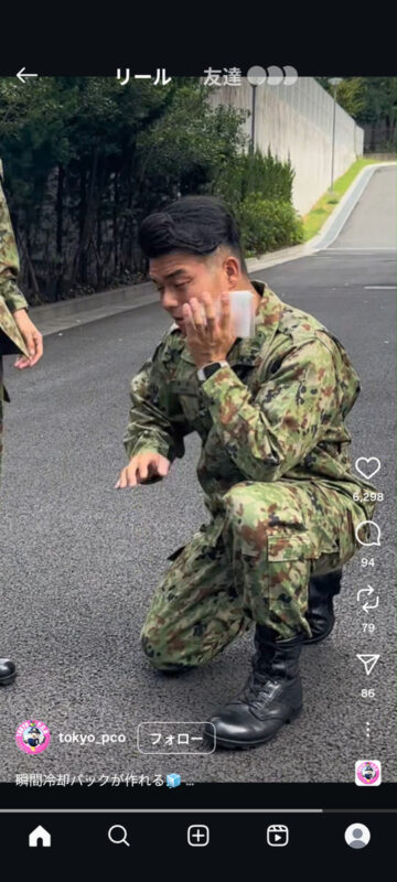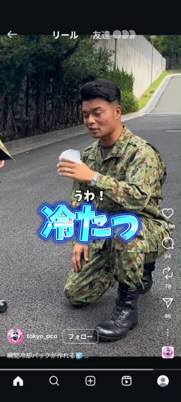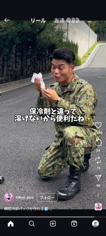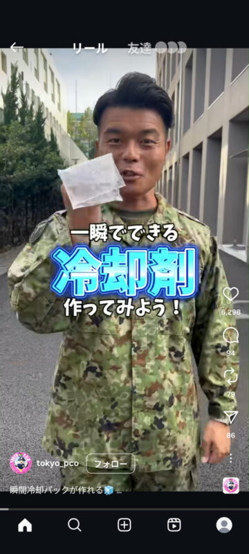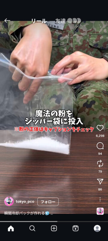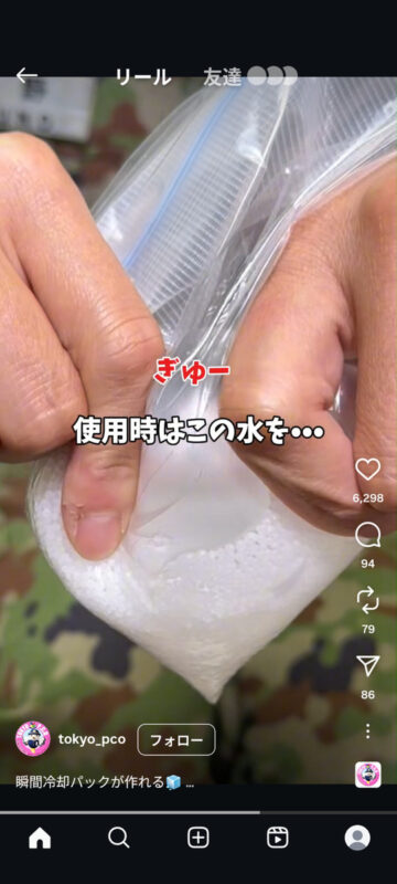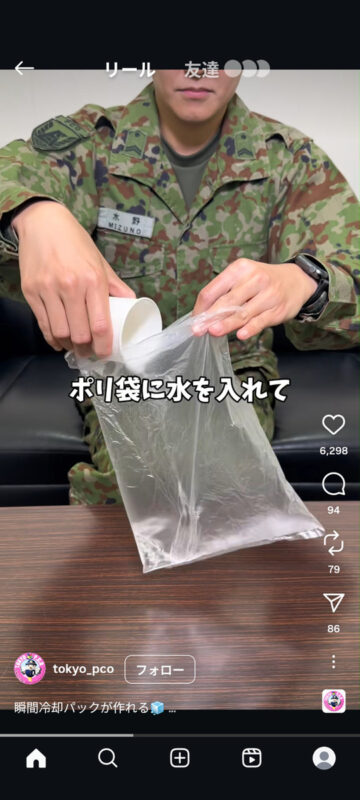 自衛隊は「冷凍する保冷剤は溶けちゃうけど、この方法なら使いたいときにすぐ使えてしかも長持ちするよ!」とインスタグラムでコメントし、「熱中症に使える! 瞬間冷却剤の作り方」というタイトルの動画を公開。この動画では、瞬間冷却剤の作り方について、次のように紹介しています。